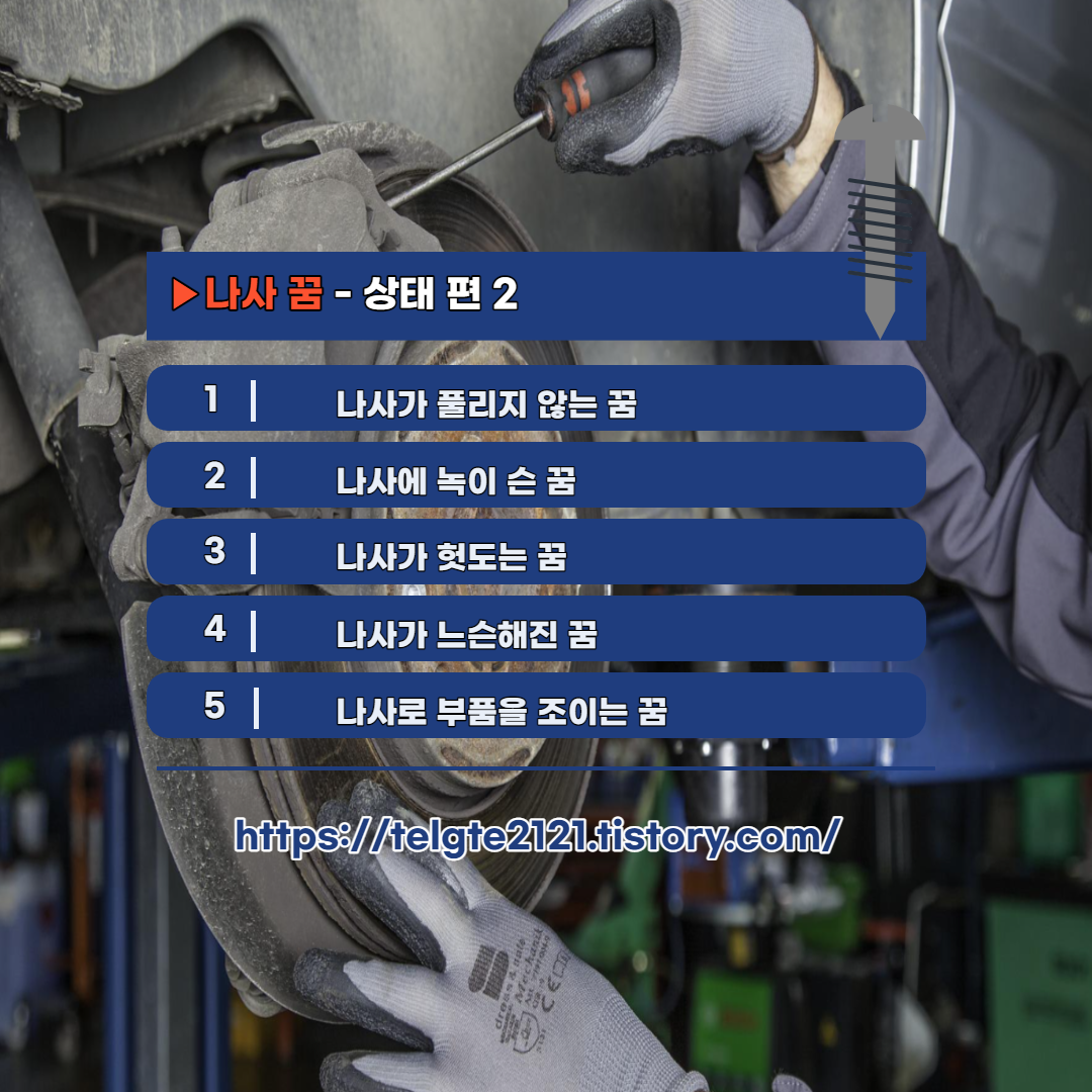 나사 꿈을 꾸더라도 나사의 종류나 크기, 상태 등은 어떠했는지에 따라 해석이 달라지기 마련입니다. 다음으로, 나사 꿈 - 상태 편 1에 대해 알아보도록 하겠습니다.