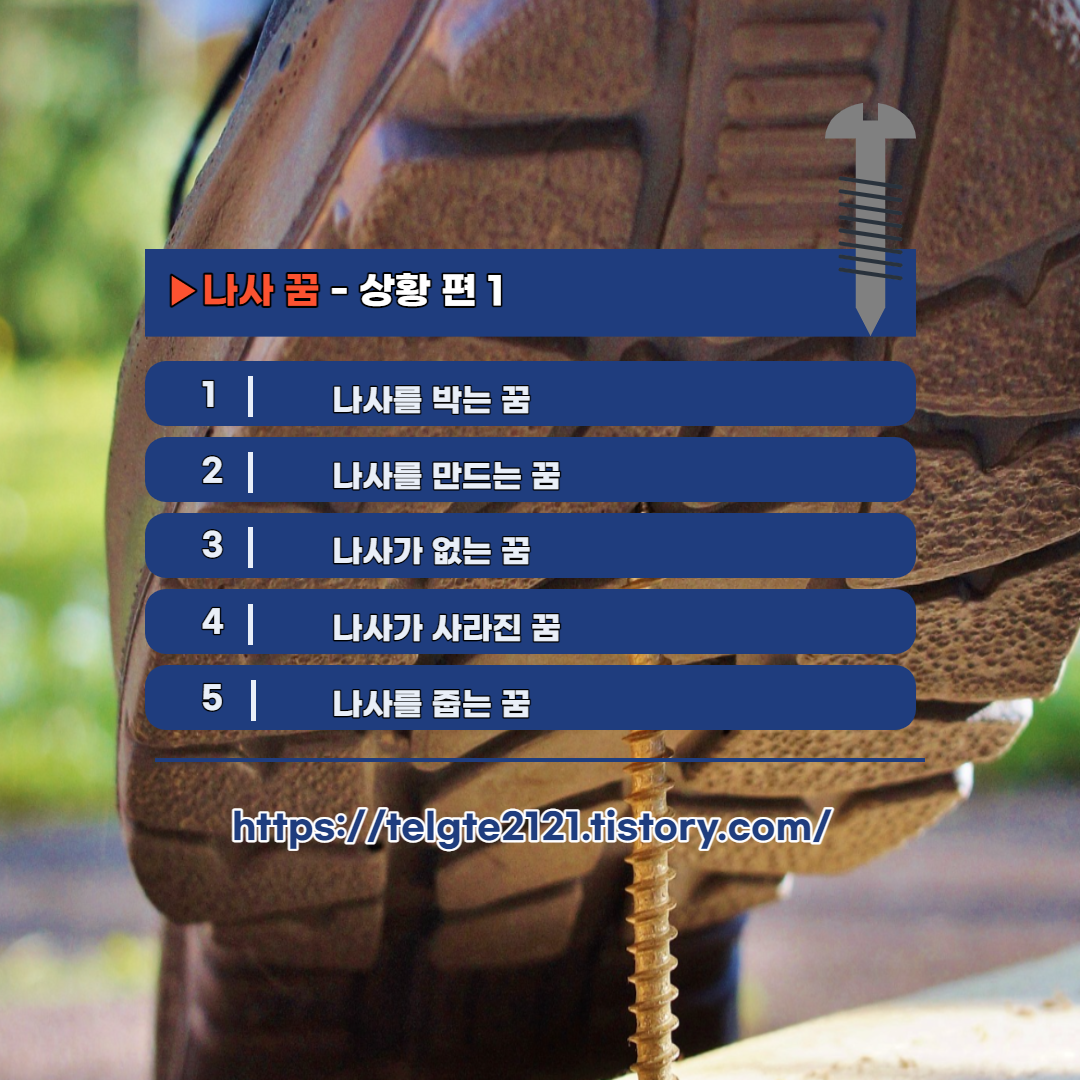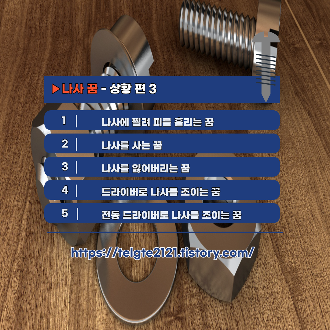 나사 꿈을 꾸더라도, 나사와 관련하여 본인과 사람들은 어떤 행동을 했으며, 나사와 연관된 많은 상황에는 어떤 것들이 있었는지에 따라 해몽이 달라질 수 있습니다. 다음으로, 나사 꿈 - 상황 편 1에 대해 알아보도록 하겠습니다.