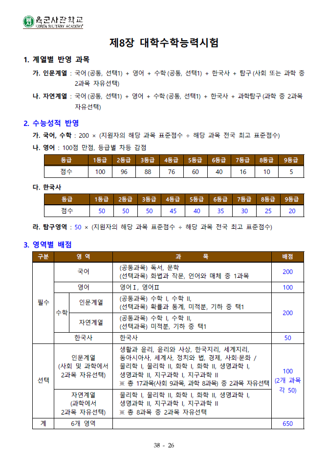 2026학년도 육군사관학교 수능 관련 내용