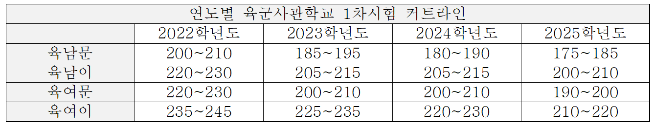 아래에서, 연도별 육군사관학교 1차시험 커트라인, 1차시험 등급컷을 확인하시기 바랍니다.